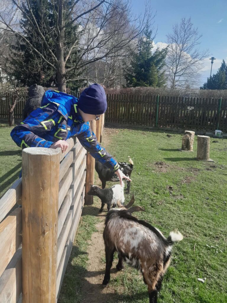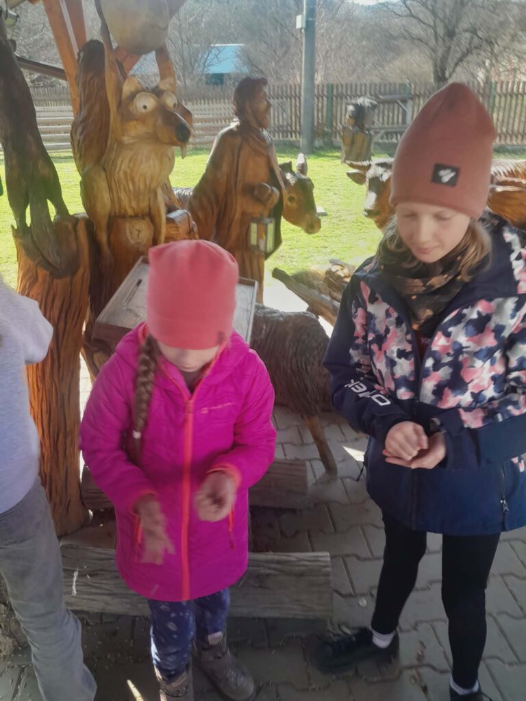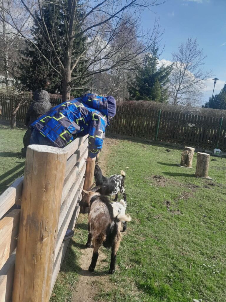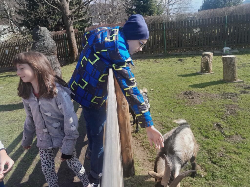 Žáci ze 3. a 1. oddělení naší školní družiny využili 24. března krásného slunečného počasí a vyrazili na procházku do Ráje dřevěných soch v Ostravici. Hlavním cílem byla návštěva místního stáda koz, které si mohli pohladit a sami nakrmit, protože majitel umělecký řezbář pan Vančura do zahrady umístil automat se zrním. Kozičky se jmenují po našich beskydských vrcholech –Skalka, Smrk a Lysá hora. Největší radost dětem udělalo nové kůzlátko, které ve stádě přibylo letos na jaře. Pokřtily ho jménem Ondřejník.