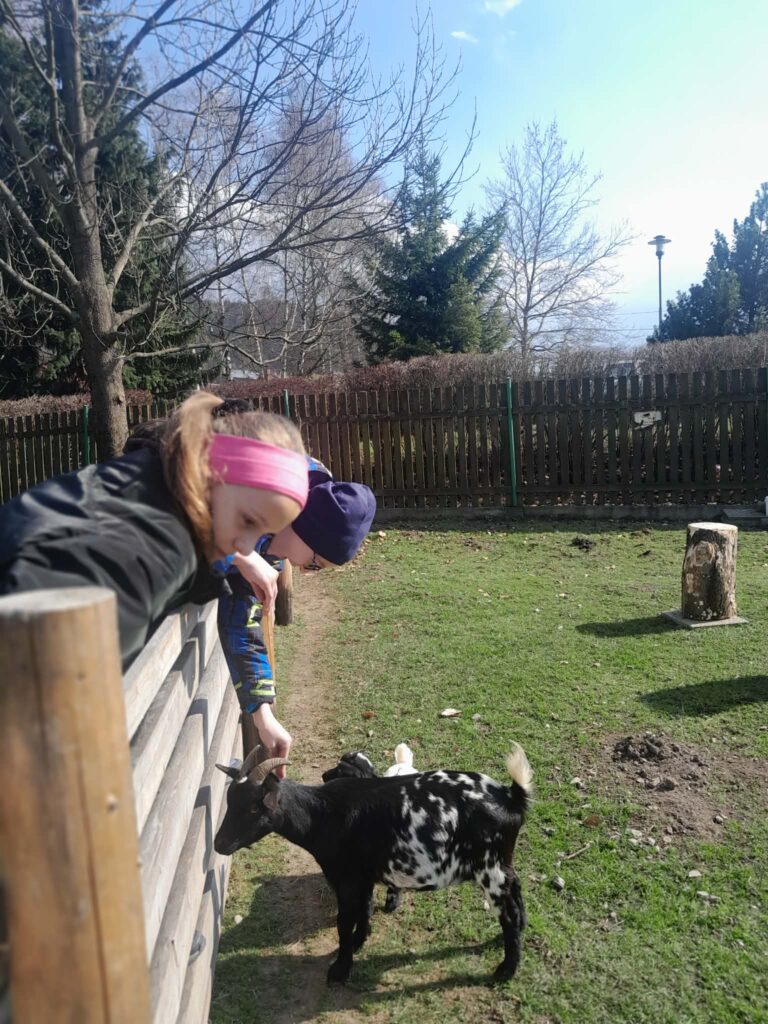 Děti se dozvěděly, že jsou tyto kozičky malí akrobaté, kteří už pár dní po narození dokážou vyskočit na vyvýšená místa a skvěle balancovat, a že jsou to velmi inteligentní zvířata, která mají výbornou paměť na tváře lidí. V zahradě plné dřevěných soch zvířátek a pohádkových postaviček soutěžily v psaní příběhů o této veselé kozí rodince, stavěly malé domečky z přírodnin, které jim březnová příroda poskytla.