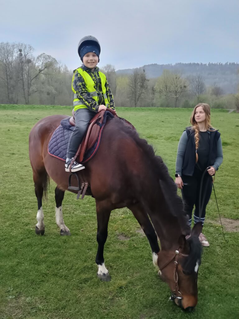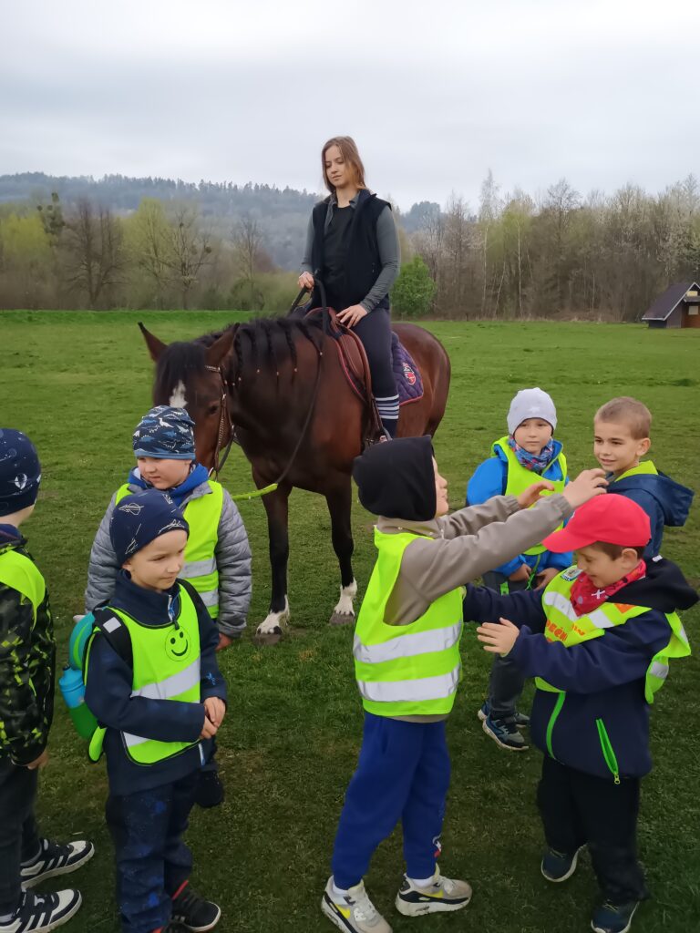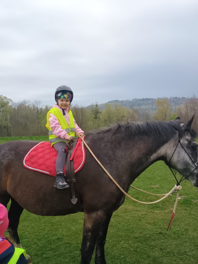 V pátek 17.4. se děti z Broučků vypravily na dobrodružnou a zdraví prospěšnou výpravu na hřiště do Pržna. Tam je čekala hned dvě překvapení. První bylo setkání s naší kamarádkou Nikolkou a jejími prarodiči. Děti se se svou bývalou spolužačkou radostně přivítaly, občerstvily dobrotami z batůžků a už je čekalo druhé setkání s kobylkou Elou a klisnou Aurorou, které dorazily po chvíli. Za doprovodu dvou dobrovolnic se všichni odvážlivci mohli projet. Však to také nebylo jednoduché. Projížďku na konících, hry na přírodním hřišti i cestování vlakem si děti velmi užily. Velký dík patří p. kuchařce Kristýnce, která nám koně poskytla.