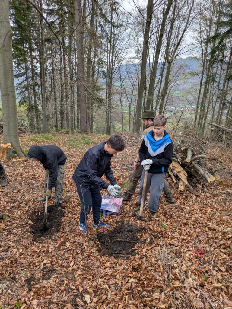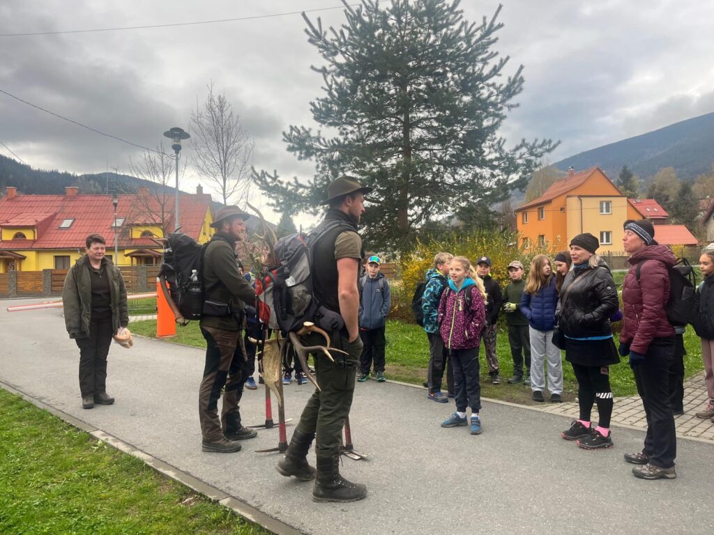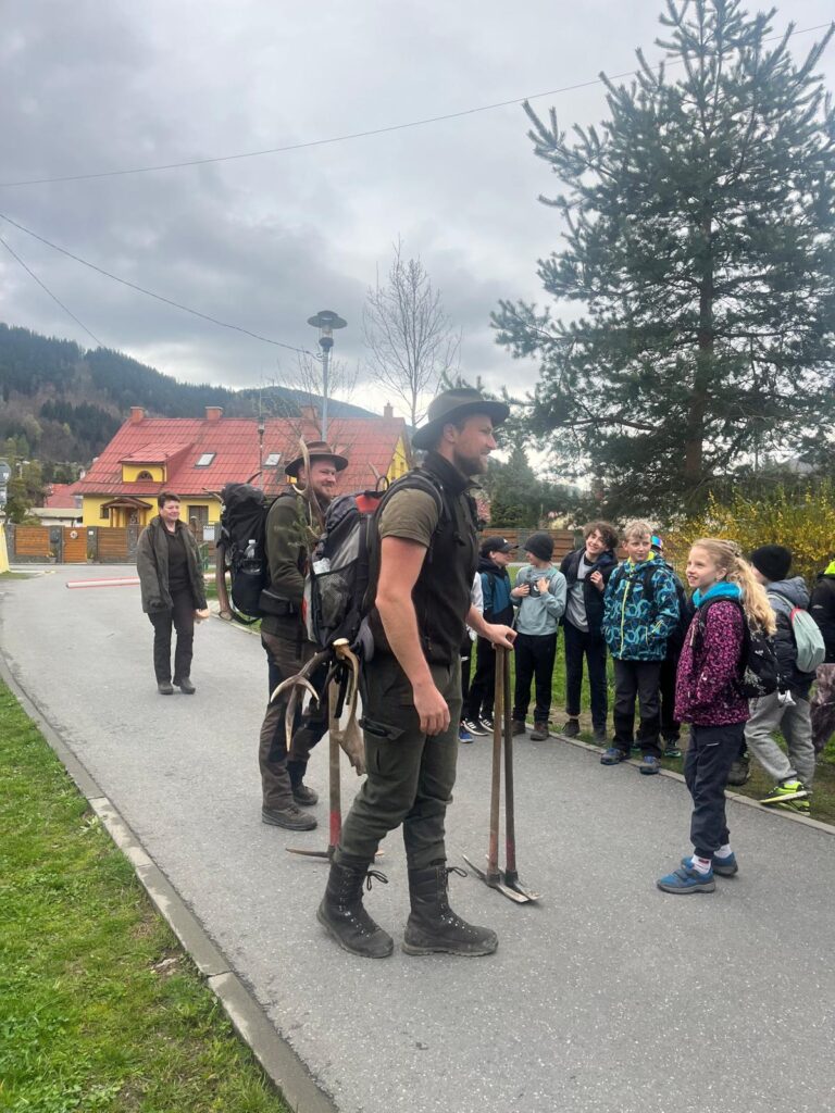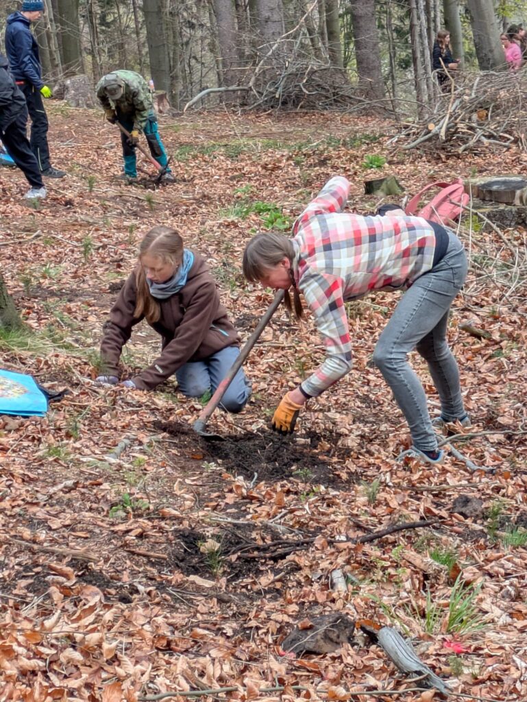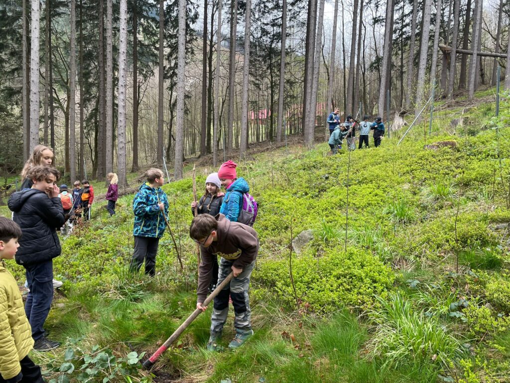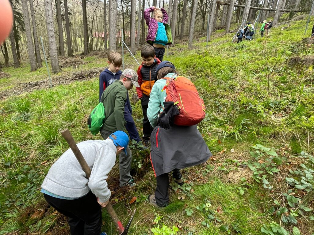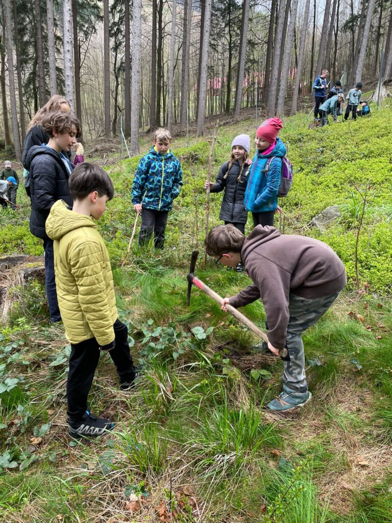 Děti z 1. stupně byly rozděleny do třech skupin. Ke dvěma skupinám se přidali šikovní mladí lesníci, kteří si pro žáky připravili velmi zajímavý, zábavný a hlavně poučný program. Společně vyrazili na vycházku do lesa, děti se dozvěděly spoustu informací o celém lesním ekosystému a dokonce vysadily i 4 malé sazeničky.