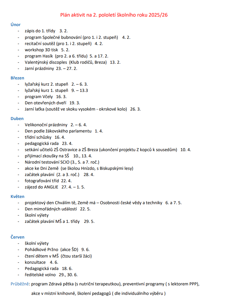 Vysvědčení s hodnocením za první pololetí bude žákům předáno ve čtvrtek 29. ledna 2026.